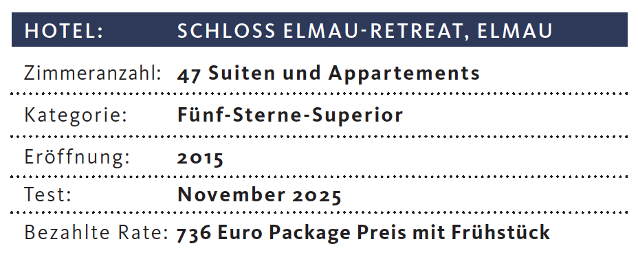 Nein, auf dem Weg liegt Elmau nicht. Wer hier zu nächtigen gedenkt, muss diesen abseits viel befahrener Straßen gelegenen Ort gezielt ansteuern. Und dennoch ist Elmau, nicht zuletzt dank zwei ausgetragener G-7-Gipfel und begleitender Medienpräsenz eines der bekanntesten Luxushotels in Deutschland. Bei der langen Liste an Hotelkooperationen und -organisationen, die Schloß Elmau auf seinen Seiten im Internet ausweist – von Leading Hotels of the World über die Fines Hotels & Resorts Collection von American Express, Select, Andrew Harper und Virtuoso bis hin zu 101 Beste und letztlich auch hotelstars.eu –, darf ruhig die Frage gestellt werden, wer sich hier mit wem schmückt.